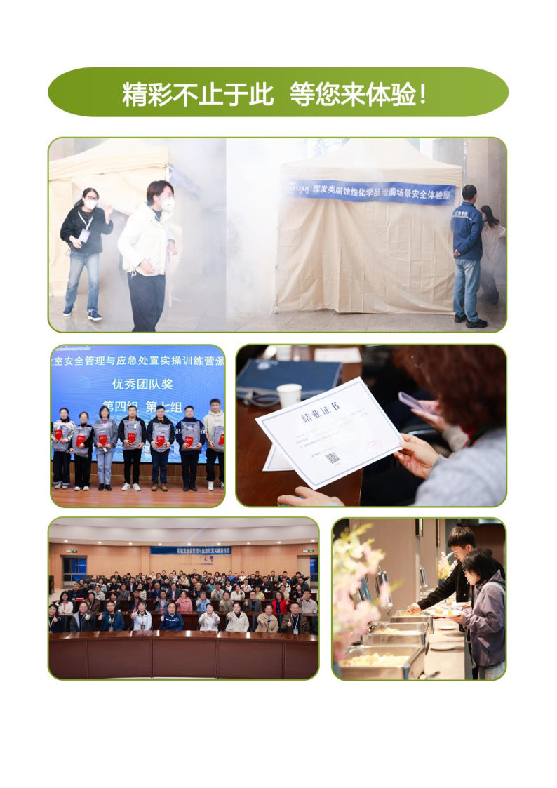 本次实验室安全训练营通过专家理论分享和手把手实践教学,让参训人员真刀实枪现场实操,将专业理论学习、隐患排查整治和应急安全处置能力提升贯穿全程,旨在引导树立人人讲安全的思想自觉,训练掌握个个会应急”的过硬本领,锤炼查找身边安全隐患的能力,培养“我要安全、我懂安全、我会安全”的本质安全型人才,让每一位参训人员眼里有专业,手中有技能,执行有方案,落地有参考。