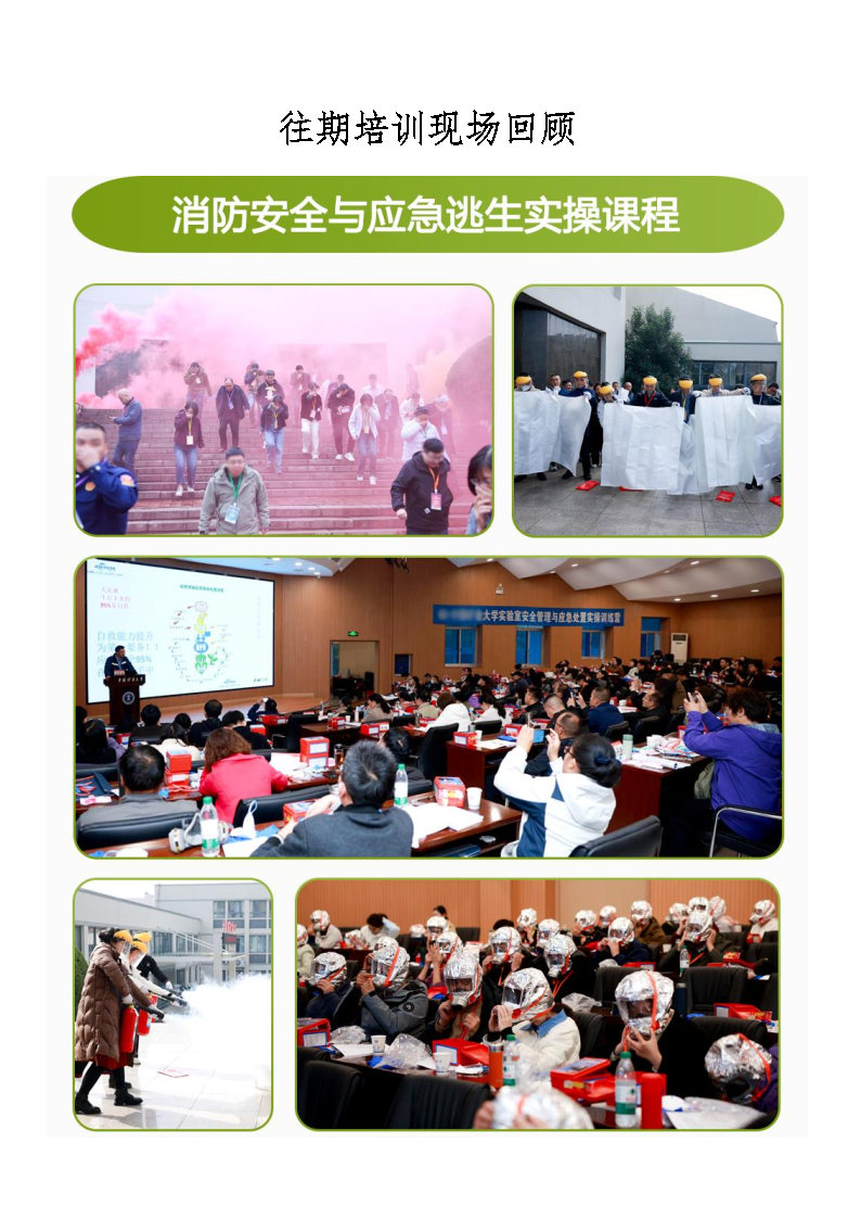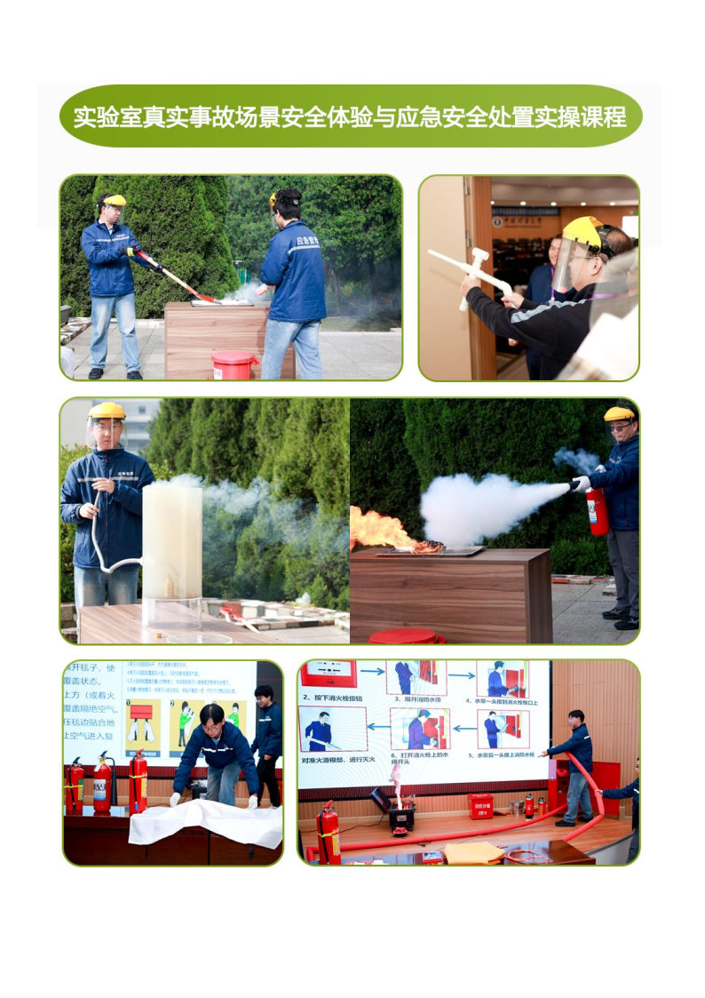实操课程:实验室消防实操课程、实验室防护用品实操课程、实验室急救实操课程、实验室火灾事故场景体验与应急安全处置实操、气体燃爆窒息及危化品事故场景安全体验与事故预防实操、气路安全操作实训实操、化学品泄漏应急安全处置实操、实验室安全教学实操、实验室安全事故应急演练实操、实验室安全训练营考核系列实操课程、实验室隐患排查与分级分类实操课程、实验室安全知识竞赛与安全应急技能竞赛等。