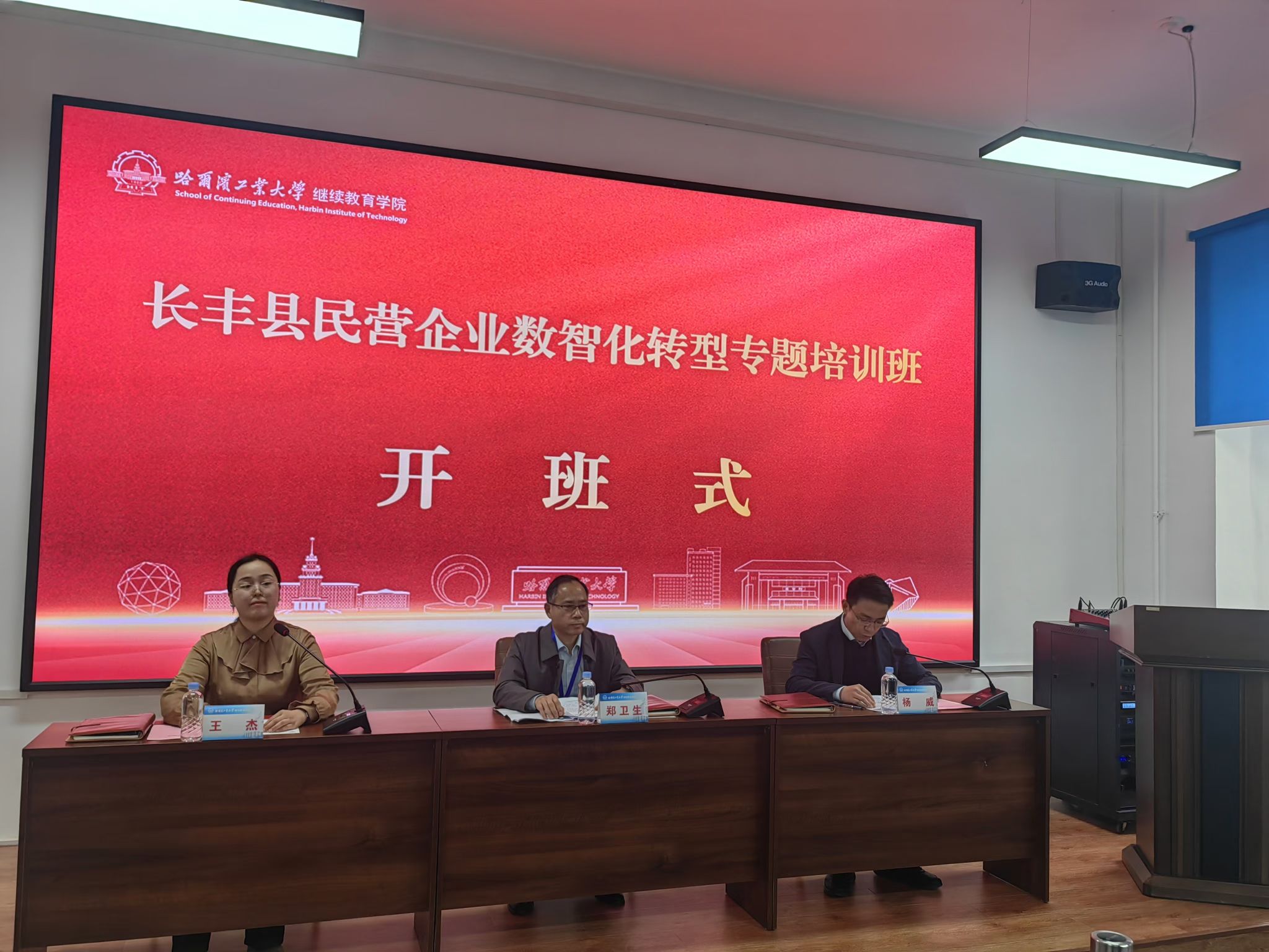 杨威简要介绍了哈尔滨的历史文化和哈尔滨工业大学的百年发展历史、办学特色、人才培养等情况。杨威表示,本次培训将依托于哈尔滨工业大学在数智领域的领先优势,邀请专家和学者为全体学员解读数智技术在企业发展中的重要作用,以帮助学员拓宽数智技术为企业发展赋能的思考路径。郑卫生表示,全体学员要提高认识,充分意识到数智化转型对于企业发展的重要意义,并能够发挥学习培训的实效,注重实践和运用。郑卫生强调,全体学员必须严守培训纪律,端正学习态度,遵守课程时间安排,展现出长丰民营企业家的良好形象。