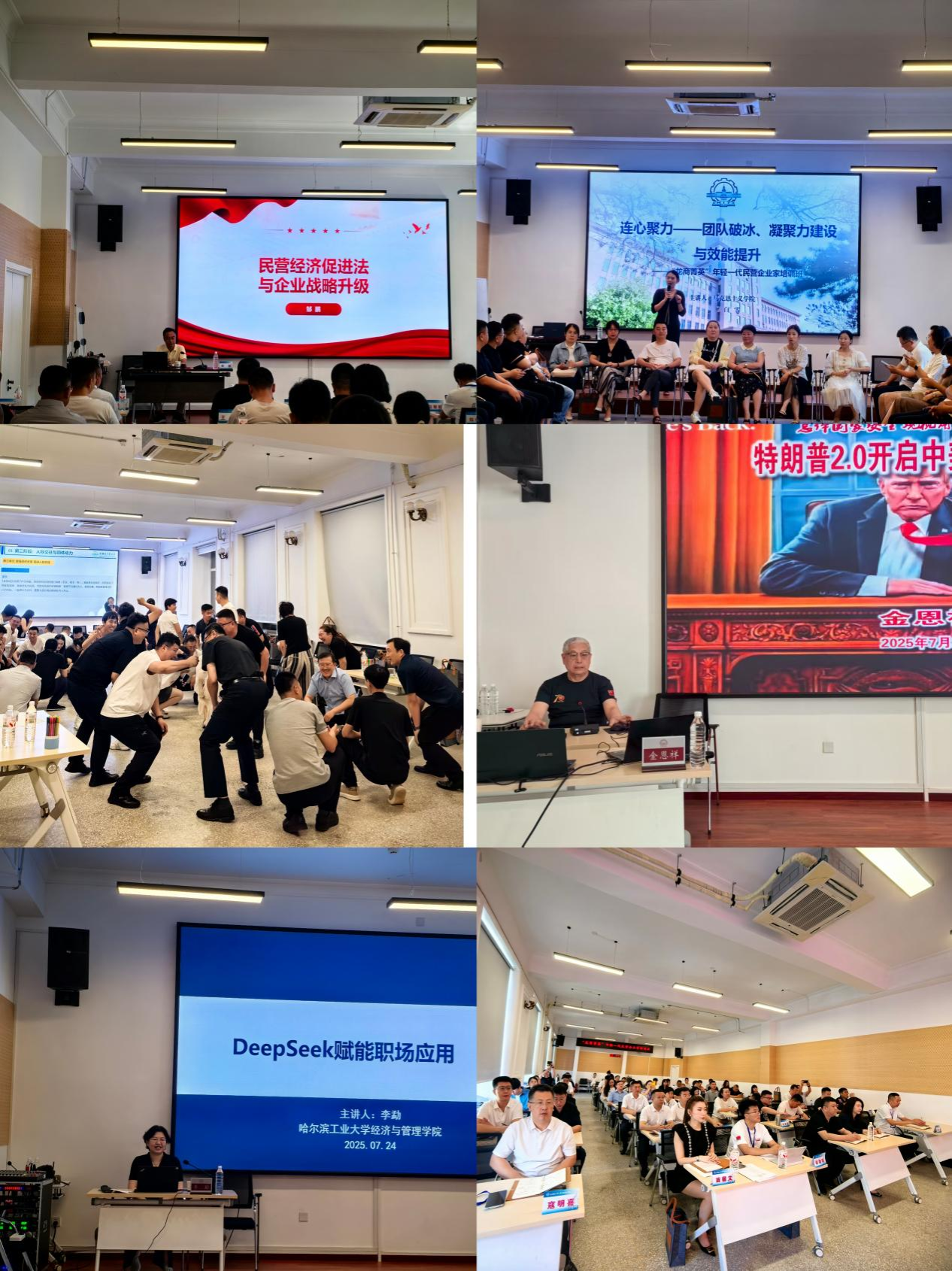 结合主办单位的学习需求,学院精心设计了教学方案。课程包含《读懂新法,抢占先机:<民营经济促进法> 与企业战略升级》《连心聚力——团队破冰、凝聚力建设与效能提升》《特朗普 2.0 开启中美博弈新时代》《以DeepSeek提升工作效能》等理论课程,并组织学员到哈尔滨工业大学博物馆、哈尔滨工业大学航天馆、哈尔滨工业大学人工智能研究院等进行现场教学。