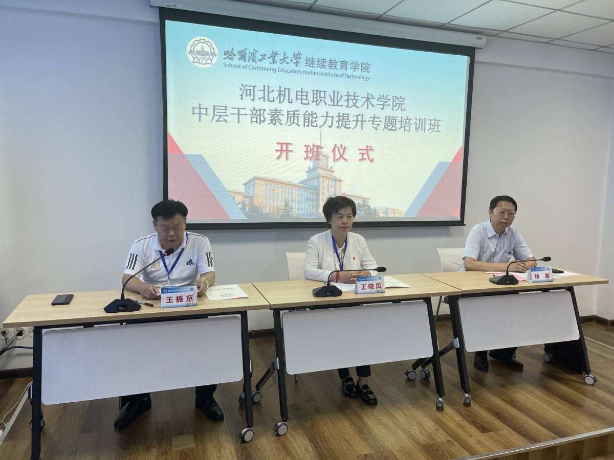 7月26日上午,培训班开班式在我校继续教育学院1205教室举行。继续教育学院副院长杨海同志介绍了哈尔滨工业大学的基本情况和我校干部教育培训工作的发展情况。河北机电职业技术学院院长王晓凤同志对我校给予本次培训的重视和所作的大量组织工作表示最诚挚的感谢,对参训学员们进行了开班动员。河北机电职业技术学院副书记王振京主持了开班式。