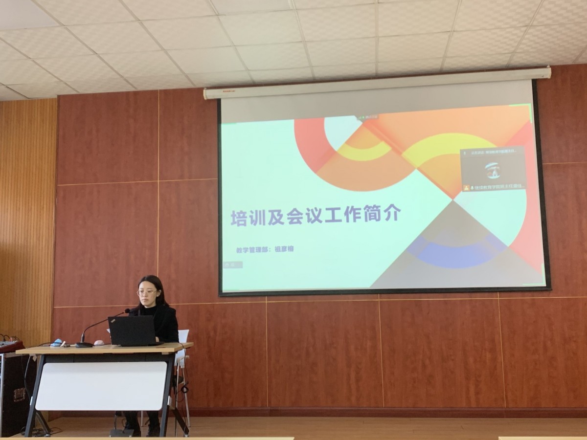 本次培训由教学管理部部长徐烈主持,继续教育学院常务副院长范轶、副院长常永吉、副院长曹云峰、副院长杨海、技术总监王永志五位领导出席。本次培训由教学管理部副部长祖彦榕从培训工作资料介绍、视频制作介绍、会议工作流程介绍三个方面进行了业务培训。