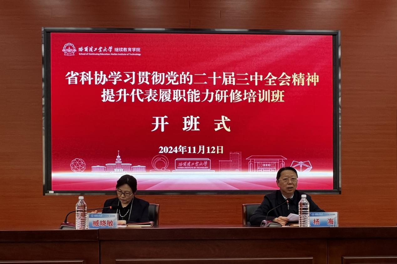 11月12日至11月15日,(黑龙江)省科协学习党的二十届三中全会精神提升代表履职能力研修培训班在我校举办,省科协党组成员臧晓敏,继续教育学院副院长杨海出席开班式并讲话。来自省科学协会的70名学员参加培训。