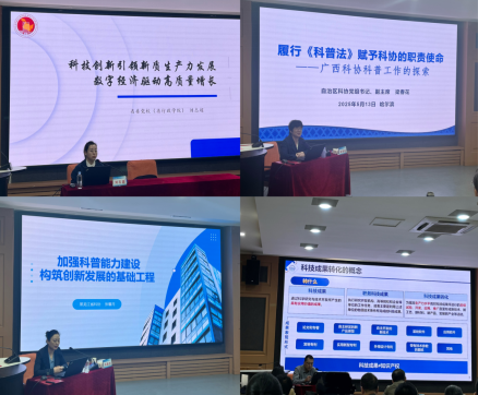 5月12日至5月16日,2025 年广西全民科学素质能力提升交流活动在我校举办,广西壮族自治区科学技术协会党组书记、副主席梁春花,广西壮族自治区科学技术协会党组成员、副主席黎宁,继续教育学院常务副院长李敬伟等出席启动仪式,广西壮族自治区科学技术协会共50名学员参加交流活动。