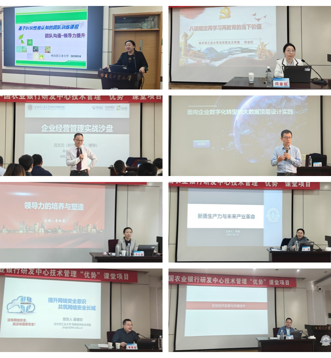 结合主办单位的学习需求,学院精心设计了教学方案,课程包含《DISC团队沟通与领导力提升》《企业经营管理实战沙盘》《人工智能发展前沿之DeepSeek与大模型应用与创新》《面向企业数字化转型的大数据顶层设计实践》《领导力的培养与塑造》《新质生产力与未来产业革命》《提升网络安全意识 共筑网络安全长城》《低空经济核心技术发展趋势》等理论课程,并组织学员到哈尔滨工业大学航天馆、侵华日军第七三一部队罪证陈列馆进行现场教学。