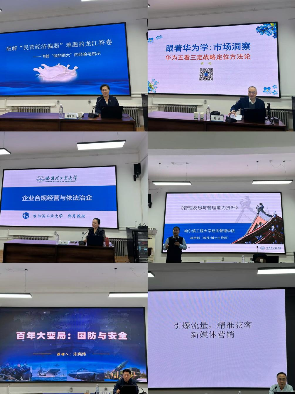 结合主办单位的学习需求,学院精心设计了教学方案。课程包含《破解民营经济偏弱难题的龙江答卷——飞鹤“做的很大”的经验与启示》《跟着华为学:市场洞察》《企业合规经营与依法治企》《管理反思与管理能力提升》《百年大变局:国防与安全》《引爆流量,精准获客——新媒体营销》等理论课程,并组织学员到哈尔滨工业大学人工智能研究院、哈尔滨工业大学航天馆、哈尔滨工业大学博物馆、飞鹤(哈尔滨)智能产业园、360城市安全大脑展厅、侵华日军第七三一部队罪证陈列馆进行现场教学。