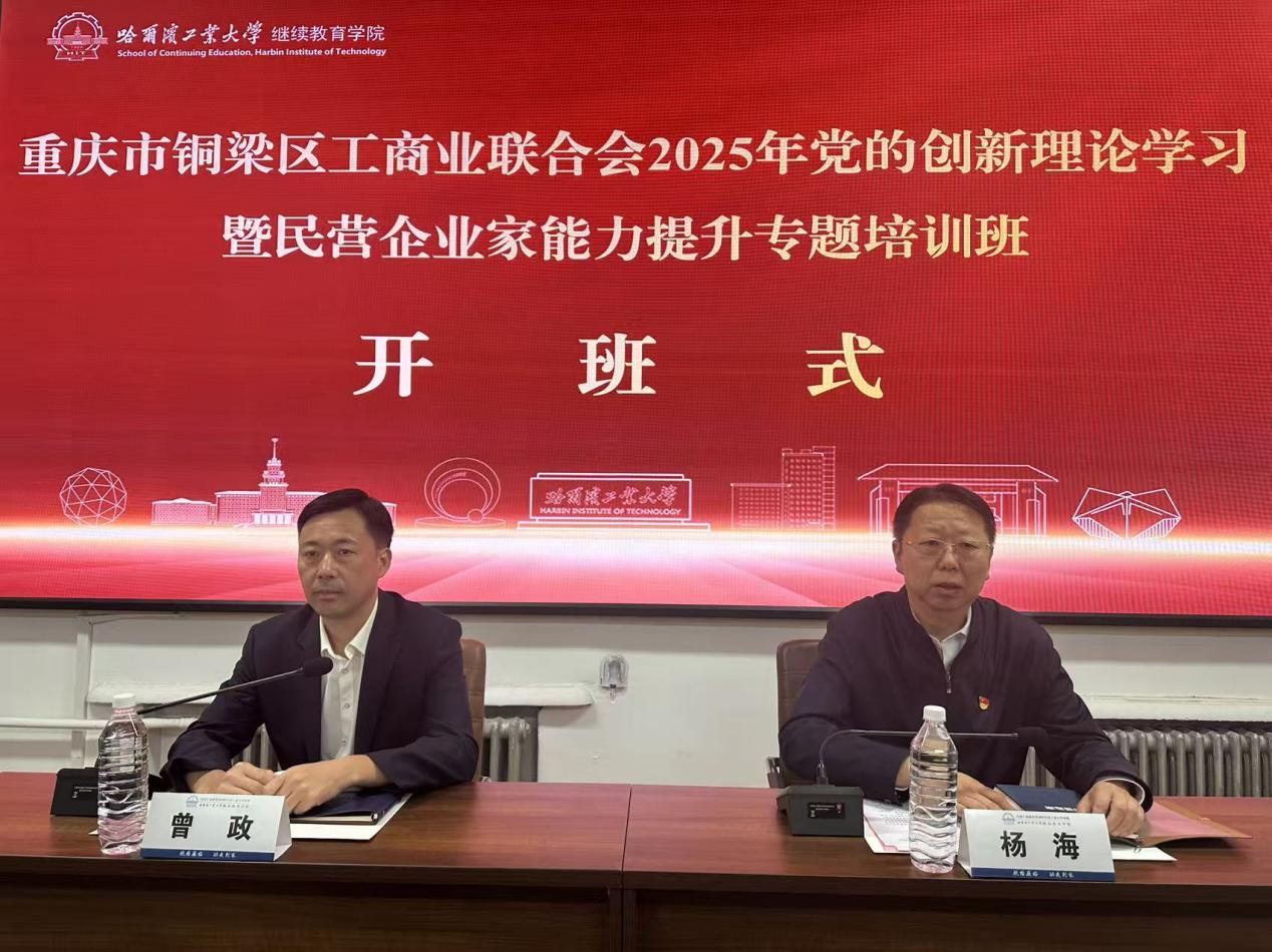 杨海简要介绍了哈尔滨的城市历史及哈工大发展历程、办学特色和人才培养等情况,以及学校取得的一系列杰出成果。他指出,本次培训深入贯彻党的二十大精神和习近平总书记在民营企业座谈会上的重要讲话,旨在提高民营经济干部的工作能力,进一步推动民营企业家和商会负责人的政治素质与领导水平。曾政强调,本次培训将依托哈尔滨工业大学在航天科技、智能制造、新材料领域的学科优势与科研资源,破解企业创新转型瓶颈,坚定持续发展信心。参训学员要将所学所思转化为破解企业发展难题的具体思路与务实举措,为铜梁区经济高质量发展贡献民营经济的坚实力量。