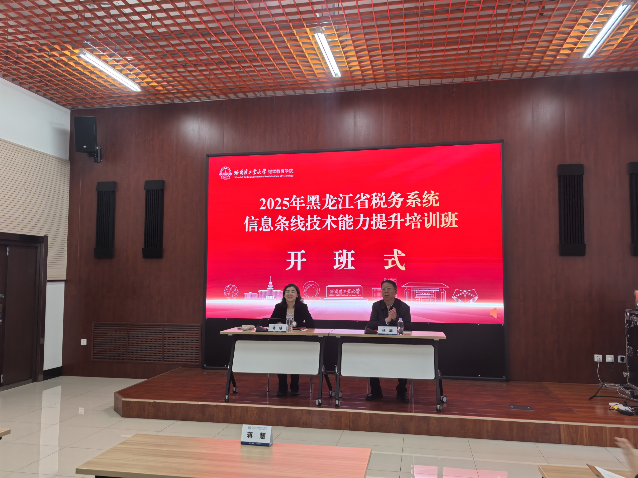 杨海简要介绍了哈尔滨的城市历史以及哈工大以贺信精神为引领,在基础研究创新、国之重器攻关、拔尖人才培养、赋能区域发展等方面所取得的卓越成就。他表示,希望双方能够以此次培训为契机,进一步拓展合作领域、深化合作内涵,把学习成果转化为推动工作的实际行动,为龙江税务系统高质量发展、可持续振兴贡献力量。蒋慧表示此次培训既是技术能力的“充电站”,更是改革攻坚的“动员令”。她对学员提出三点要求:一是遵守纪律,服从管理;二是集中精力,深入学习;三是结合实际,学有所用。将培训成果转化为工作实效,成为单位信息化建设的“种子选手”和“传帮带”骨干;牢记“技术赋能税务”的初心,在深化税收征管改革中展现信息人的作为。