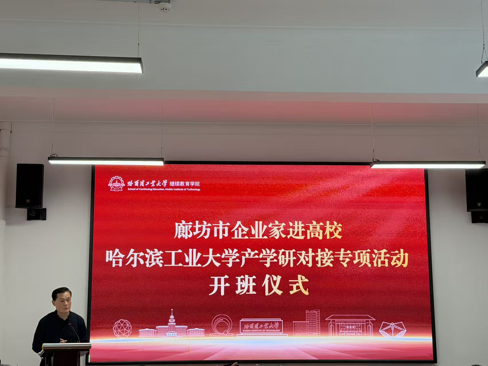 马欣简要介绍了哈工大的百年历史、师资力量和学科成就,希望参训学员借助哈工大的学术资源,拓宽视野、提升能力。他指出,学校与河北廊坊有着深厚的合作基础,双方在科技研发、协同创新和联合攻关等方面开展了紧密合作,取得了丰硕成果,希望双方以此次培训为契机进一步交流合作。马俊在讲话中强调,本次活动旨在为企业与顶尖高校搭建精准对接的桥梁,构建“企业出题-高校解题-政府助题”的创新生态。期待借此机会,借助哈工大雄厚的科研与人才优势,切实帮助企业破解技术难题,加速科技成果转化,为廊坊工业经济高质量发展注入新动能。